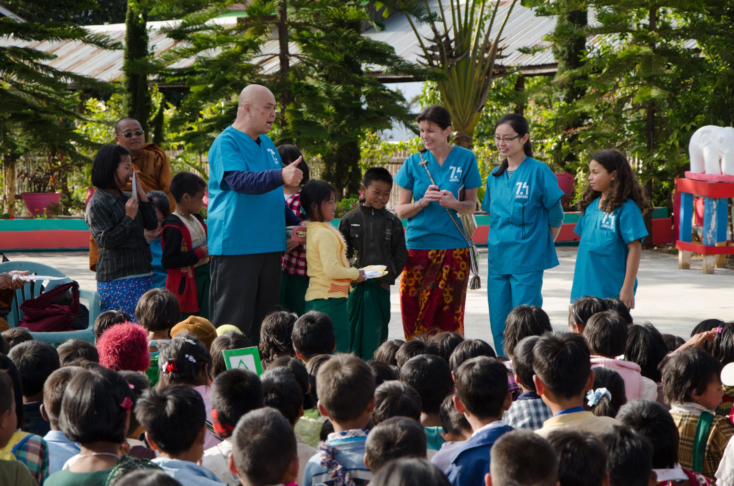 Our connection began in 2012, when Sayadawgy Pannasiri (“Paung Paung”), a distinguished Burmese monk traveled  to the US.  He visited 26 states and met thousands of people over the course of a couple of months.  Amongst those he met were the Chu family.  Upon meeting Charles Chu, Paung Paung felt a strong connection, one he describes as a past life karmic connection.  Paung Paung invited Charles and his family to visit him and stay at his monastery on a remote mountain top in western Burma. Inspired by the beauty and poverty of his home county, Charles returned to the states with a vision to return to Burma, but this time with a humanitarian purpose.  He asked his good friend Dr. Maureen Valley to bring  a team of dentists to the monastery to treat the monks, orphans and local villagers.  He spoke to Paung Paung who thought it was a fantastic idea, and that’s how the 1World 1Tribes oral health project began in Burma!